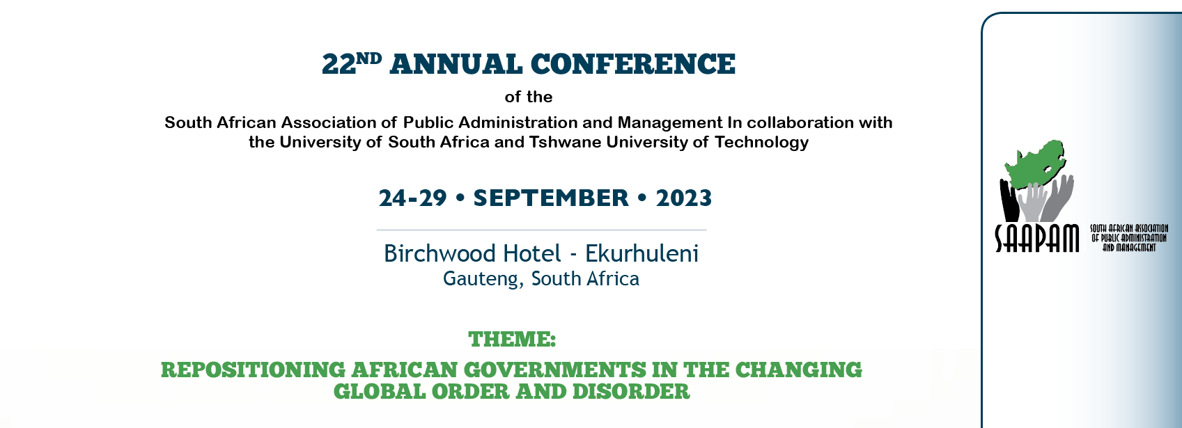 The South African Association of Public Administration and Management (SAAPAM) is pleased to announce that it will be hosting its annual Conference in collaboration with the University of South Africa and Tshwane University of Technology which will be held from 24 – 29 September 2023 at Birchwood Hotel in Ekurhuleni. This year’s conference theme is “Repositioning African Governments in the Changing Global Order and Disorder.”